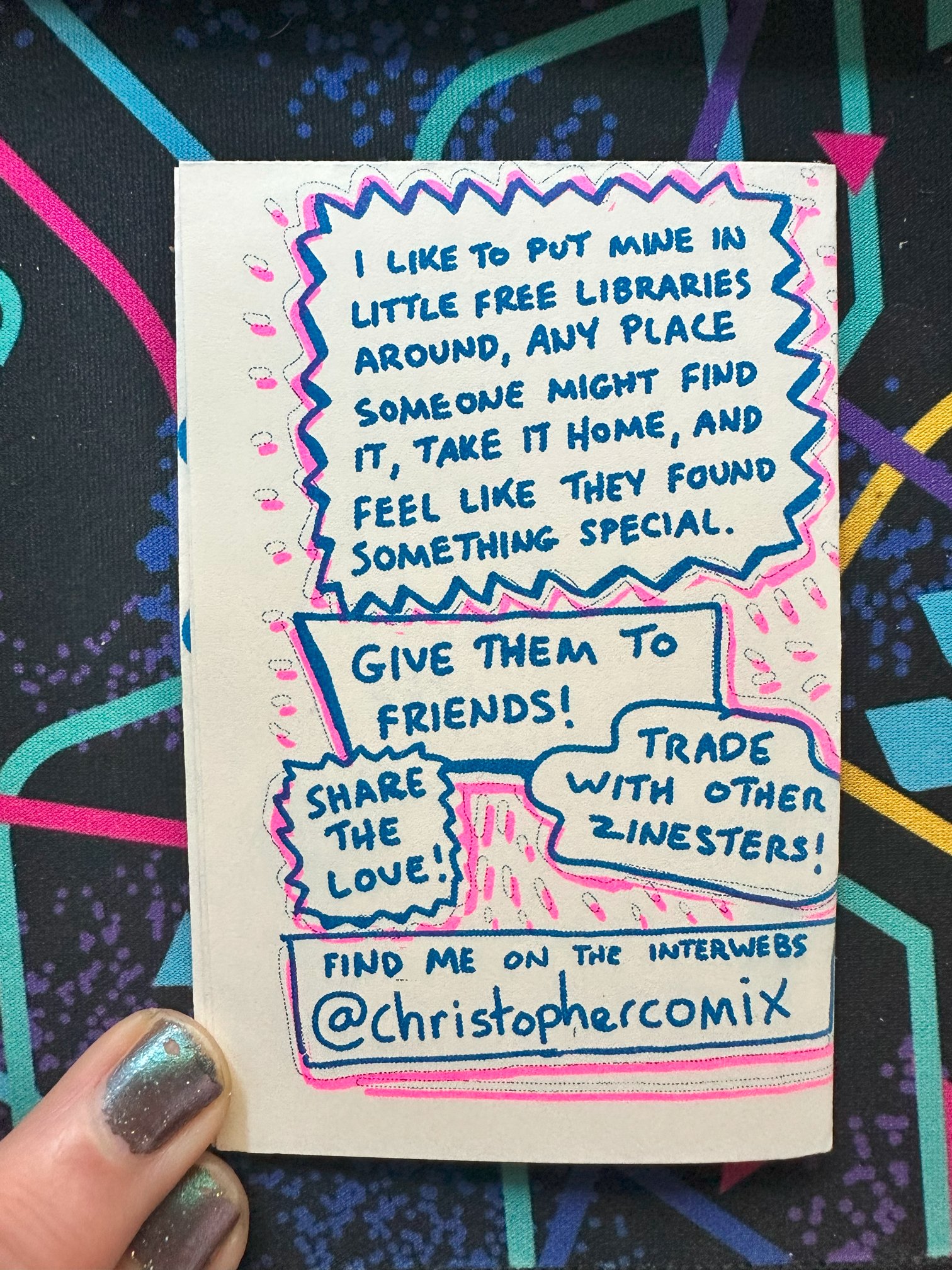 A folded single-sheet risograph-printed zine about making zines! Includes easy to follow instructions to make a single-sheet zine. Each risograph zine is printed with various charming offset irregularities on nice paper with bright inks and fun halftone patterns.